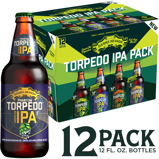 Unbox maximum hops with the Torpedo IPA Pack! Featuring two exclusive new varieties: Phantom Torpedo and Electric Torpedo. Sierra Nevada rotates the beers in this pack multiple times per year and includes special edition beers that are only available in this pack and in their taprooms. Please note that the 12-pack you order online may be slightly different than the one pictured here. Torpedo Extra: Taste explosive hop flavor with Torpedo's intense notes of citrus, tropical fruit, and pine. Electric Torpedo (NEW): This high-voltage West Coast IPA features a striking balance of orange, stone fruit, and herbal hop flavors. Atomic Torpedo: This imperial hop collision fuses West Coast and Juicy IPAs, unleashing atomic flavor. Phantom Torpedo (NEW): This American IPA delivers layers of tropical, citrus, and woody hop flavors that reappear with each sip.