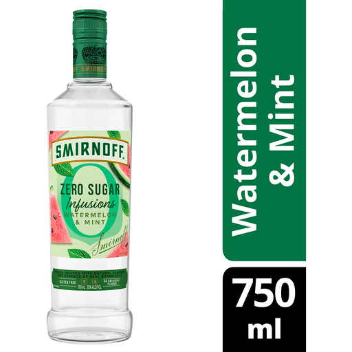 Smirnoff Vodka, Watermelon & Mint 750 MlNo artificial flavors. Gluten free. Zero sugar. Vodka infused with natural flavors & essence of real botanicals. Splash in some soda! Garnish! Done! DrinkiQ.com. Please recycle. 30% alc/vol.