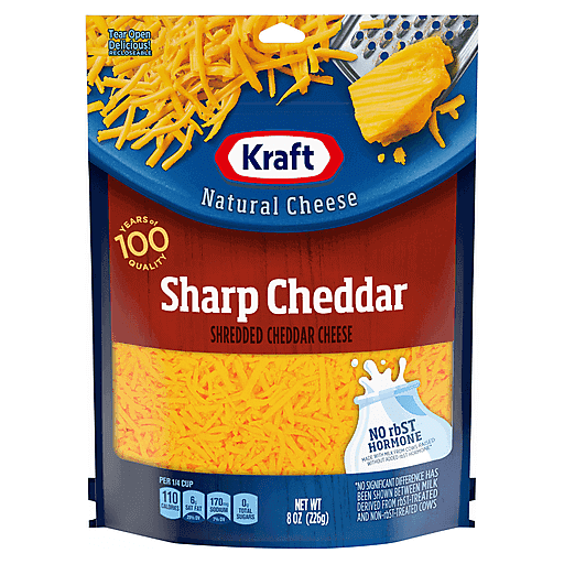 Mealtime can be hard, especially when it comes to making something everyone agrees on. Use Kraft Natural Sharp Cheddar Shredded Cheese to make something everyone will love, so you can spend time focused on each other and not worried about making everyone happy. Kraft Natural Sharp Cheddar Shredded Cheese comes backed by a brand with more than 100 years of cheese making experience. This cheese has a rich, creamy flavor guaranteed to enhance your family's favorite dishes. This easy to melt cheese comes pre-shredded, so it sprinkles evenly over any dish to add gooey goodness. Layer this cheddar cheese in casseroles, sprinkle it over salads, use it on homemade pizzas or to make ordinary pasta dishes extraordinary. Each 8 ounce bag of cheese is resealable to help lock in flavor. Made with milk from cows raised without added rbST hormone. No significant difference has been shown between milk derived from rbST-treated and non-rbST treated cows.