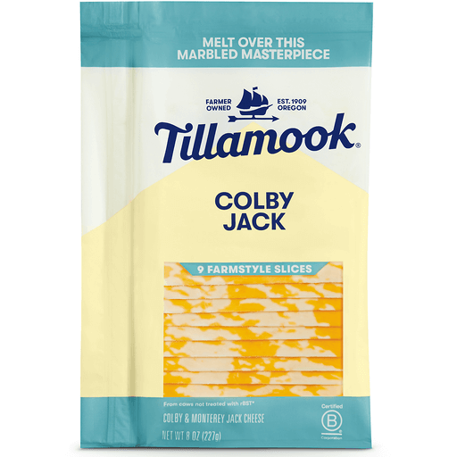 Melt over this marbled masterpiece. Farmed owned. Est. 1909 Oregon. 9 farmstyle slices. From cows not treated with rBST (All farmers who supply milk for Tillamook products pledge not to use artificial growth hormones. The FDA has stated that no significant difference has been shown between milk derived from rBST treated and non-rBST treated cows). Tastes better because it's made right. When you want award winning flavor. This is the cheese to choose. Certified B Corporation. As a proud Certified B Corp we promised to put the land, cows and people first - always. Learn more at tillamook.com.