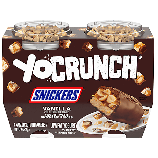 Add some crunch with a 4-pack of YoCrunch(R) Vanilla Lowfat Yogurt with SNICKERS(R).* This vanilla yogurt is deliciously smooth and creamy. Best of all, it comes with SNICKERS(R) candy pieces as a topping so you can add a fun crunch to every bite. At YoCrunch, we’ll never stop cranking up every basement and basic hang with some yogurt goodness and a whole lotta crunched up, over-the-top fun. Our yogurt comes in single serve yogurt cups, pairing tasty flavors with delicious toppings for a pre-portioned, off-the-charts yummy treat. A good source of vitamin D, these sweet snacks offer the goodness of yogurt with crunchy SNICKERS(R) candies your family will love. YoCrunch puts snack time in your control. Grab a yogurt cup and sprinkle your desired amount of toppings, save them for last, or mix 'em all in for maximum crunch. Pack as a snack for school or road trips. Enjoy them as snacks to go during busy days or for a fun mid-day break. Available in a wide range of flavors and toppings, YoCrunch offers a fun experience the family can enjoy. Mix it up with YoCrunch Vanilla Yogurt with SNICKERS(R) Candy Pieces. *(C) Mars or Affiliates.