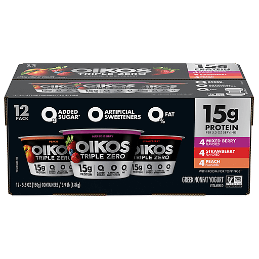 Enjoy epic tastes with Oikos Triple Zero Nonfat Peach, Strawberry and Mixed Berry Greek Yogurt Pack, twelve delicious nonfat Greek yogurt cups with more of what you want and less of what you don’t. Each Oikos Triple Zero yogurt cup contains 0% fat, 0g added sugar* per 5.3 oz serving and 0 artificial sweeteners. Our flavored Greek yogurt packs a punch with 15 grams of protein per serving, so you can always have dependable, high protein snacks with zero holding you back. Because when you feel strong, you are unstoppable. With protein and deliciousness, this Greek nonfat yogurt can help you strive to reach your potential with every serving. Protein is important - an essential nutrient that we need in our diet - and Oikos Triple Zero cups are great tasting, convenient solutions for adding complete protein every day. Pack a Greek yogurt cup for days that start at a sprint and enjoy a delicious boost of protein at lunch. Or throw in your favorite fruit or toppings for an extra refreshing snack. For even more reasons to go Greek, try Oikos Pro snack cups with 20g of protein per serving or Oikos Blended with pieces of real fruit. Oikos Greek yogurt — Stronger Makes Everything Better (R). *Not a low-calorie food.