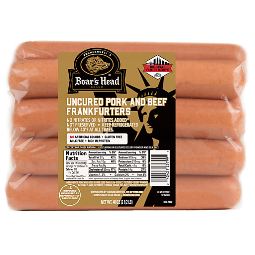 Boar's Head Uncured Pork & Beef Frankfurters 16 OzCrafted from an original family recipe, Boar's Head® Uncured Pork & Beef Frankfurters are made with high quality, hand-packed cuts of beef & pork for a unique flavor.