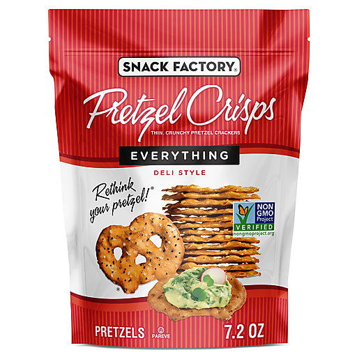 Dip or no dip, Snack Factory Everything Pretzel Crisps are flat-out delicious. Our Everything Pretzel Crisps are generously sprinkled with poppy seeds, onion, garlic and salt. How much more flavor could you want? A modern, gourmet twist on an old favorite, these thin and crunchy pretzel chips give you the best part of traditional pretzels without the doughy center. They’re perfectly seasoned and baked just right for a hearty, satisfying crunch in a slim, sturdy shape that's dippable, toppable and deliciously snackable. Snack Factory Everything pretzel thins are tasty on their own and they hold up to almost anything, so they pair perfectly with hummus, cheese or any of your favorite dips. For that Everything bagel flavor, try them with cream cheese. Looking for a quick and easy appetizer idea for your next party? Top these flat, thin pretzels with warm spinach and artichoke dip, microgreens and radish to create tasty Farmer’s Fiesta bites. Snack Factory Pretzel Crisps are made with quality ingredients and are Non-GMO Project Verified. This 7.2-ounce bag contains about 7 servings and is perfect for stashing in your pantry so you can satisfy your cravings for salty snacks. Since they’re so incredibly versatile, our pretzel crackers are also ideal for serving to guests. In addition to Everything, Snack Factory pretzel chips are available in other unique flavors such as Buffalo Wing, Garlic Parmesan and Cheddar Cheese.