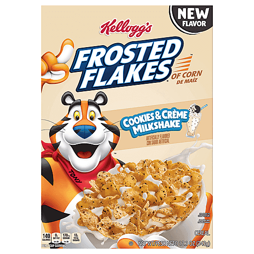 It’s a twist on the classic flavors that milkshake lovers will devour. Kellogg's Frosted Flakes Cookies and Creme Milkshake breakfast cereal gets your busiest days started strong. These toasty, crunchy corn flakes are bursting with sweet cookie and creme flavor. Each bowl creates slurp-worthy flavored milk so adults and kids can experience a tasty and satisfying bowl every time. Each serving of this cereal is a good source of 6 vitamins and minerals; Enjoy a bowl of Kellogg's Frosted Flakes Cookies and Creme Milkshake with your favorite dairy or nut milk. Eat pawfuls as a snack or late-night bite. Make it a sweet complement to your morning coffee or tea, or crush them on top of ice cream. Whether you love the sweet cereal milk or the crispy crunch of cookies and creme-flavored corn flakes, you'll find a tasty bowl of cereal that's delicious any time of day. Kellogg's Frosted Flakes cereal gives you the sweet spark to go all in and let your GR-R-REAT out.