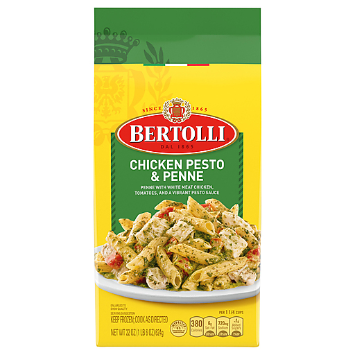 Devour a delicious Italian-inspired meal that's easy to prepare with Bertolli Chicken Pesto and Penne Pasta. Enjoy every bite of penne pasta with 100% natural* white meat chicken and tomatoes in a vibrant pesto sauce for a tasty prepared meal you are sure to love. This frozen chicken skillet meal is made without artificial preservatives** and has no artificial flavors or colors. Each bag of pesto chicken and pasta is easy to prepare in a skillet on your stovetop so you can treat yourself to delicious Italian flavor in the comfort of your own home. Bertolli frozen meals are full of flavor and thoughtfully prepared in Italian tradition. Frozen meals, fresh taste.