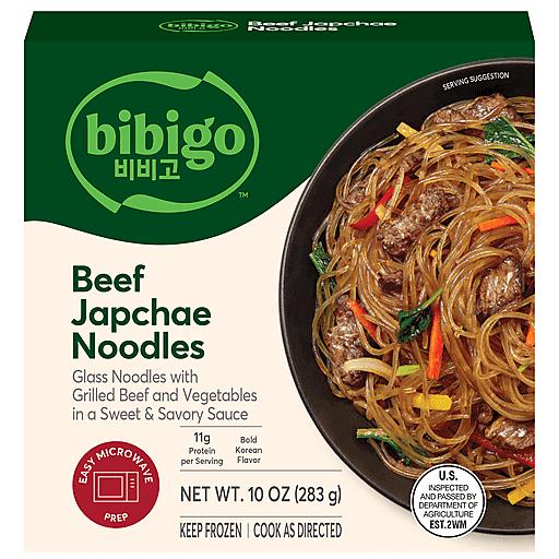 With every bite of bibigo Beef & Vegetable Japchae, you'll experience bold flavors rooted in Korean culinary traditions. This Korean-style creation is made with marinated beef, glass noodles, carrots, red bell peppers, spinach, and onion mixed in a sweet and savory sauce. Delicate and chewy, japchae noodles absorb each layer of flavor for a bowl that is good until the last bibi-slurp. A single serve portion makes mealtime prep and clean up as quick as it is delicious. Need a little bit of extra kick? Satisfy your spicy side with the addition of bibigo Hot & Sweet Gochujang Sauce to bring everything together with the right balance of spice and flavor. Whether served as a main dish or shared as a side, bibigo Beef & Vegetable Japchae Noodles are a favorite you'll want to eat by the bibi-bowlful.