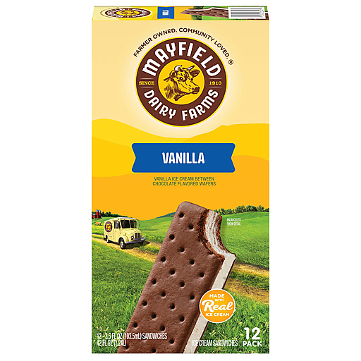 Mayfield Vanilla Ice Cream Sandwiches are frozen ice cream treats that you'll want to share with friends and family. Just like when Mayfield Dairy Farms started in 1923, every scoop of our ice cream starts with fresh cream from our own dairy, for a genuine Southern homemade taste you'll love. Inspired by family recipes and crafted with the finest quality ingredients, each creamy vanilla ice cream sandwich offers rich vanilla flavored ice cream between chocolate wafers, delivering a unique and delicious taste from fresh cream made with no artificial growth hormones.* With 12 tasty frozen desserts per pack, Mayfield ice cream sandwiches help you celebrate special everyday moments with your loved ones. With recipes inspired by beloved food traditions of the South that have been perfected over three generations, Mayfield provides timeless treats to bring everyone together.*Our Farmers pledge not to use artificial growth hormones in our cream and milk. No significant difference has been shown in milk from rbST treated cows and non-rbST treated cows.