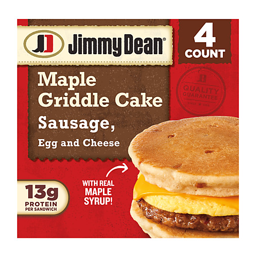 Skip the drive-thru and enjoy a warm breakfast sandwich at home. Jimmy Dean Sausage, Egg, and Cheese Maple Griddle Cake Sandwiches are a sweet way to start the day. Each breakfast sandwich is made with signature seasoned sausage, eggs, and melty cheese, all between two fluffy pancakes made with real maple syrup. To prepare, simply warm in the microwave for less than two minutes and enjoy a convenient and filling breakfast sandwich packed with 13 grams of protein per serving. Every box contains 4 Jimmy Dean breakfast sandwiches. Keep frozen until ready to prepare breakfast and get the day started.