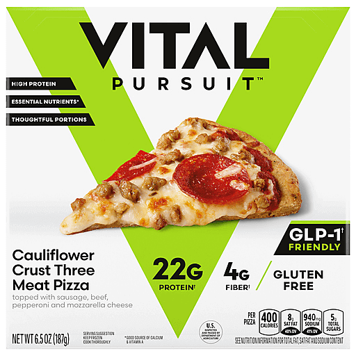 Introducing Vital Pursuit™ Cauliflower Crust Three Meat Pizza – a delectable fusion of a cauliflower crust topped with sausage, beef, pepperoni and mozzarella cheese, crafted to offer you a satisfying and wholesome lunch or dinner. Our pizza is designed for those who seek convenience without compromising on nutrition. This frozen pizza has twenty-two grams of protein and four grams of fiber per serving, ensuring that you stay fueled and satisfied throughout your day the right way. Our portion-aligned individual pizza is thoughtfully created with essential nutrients, delivering a good source of calcium and vitamin A. With no artificial colors, you can support your weight management journey with our cheesy cauliflower crust pizza and crush your goals.