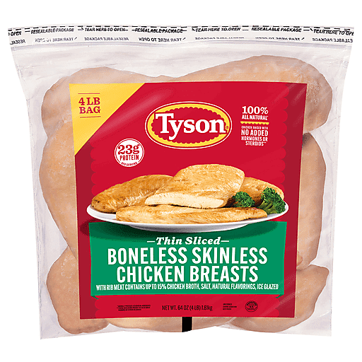 There's nothing like cooking from scratch, especially when you start with Tyson Individually Frozen Boneless Skinless Chicken Breasts. Our all-natural* chicken is juicy and tender with 23 grams of protein and 0 grams of trans fat per serving. Perfect for grilling and roasting, simply cook and serve our boneless chicken breasts with BBQ sauce for a quick and delicious weeknight dinner. Includes one 4 lb package of individually frozen chicken. Everything seems to turn out a whole lot better when you just keep it simple. No nonsense. Just stick to the good stuff. The 100% real stuff that makes life, and chicken, great. . Keep it real. Keep it Tyson. *Minimally processed, no artificial ingredients.