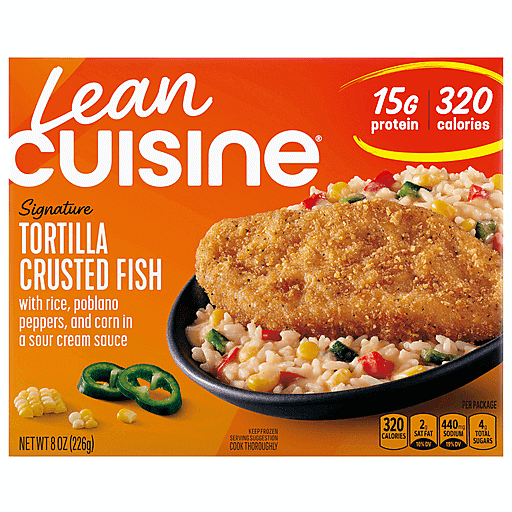 Add a kick of protein to your day with a Lean Cuisine Protein Kick Tortilla Crusted Fish Frozen Meal. At 320 calories and 15 grams of protein per package, this easy-to-make Lean Cuisine frozen meal contains 21% daily value of protein and features fish with rice, poblano peppers and corn in a sour cream sauce. Each 8-ounce frozen fish dinner can be enjoyed on its own or served with a side salad. Pair your Lean Cuisine frozen bowl with soup, or customize it with your favorite add-ons. This microwave meal is ready in less than six minutes and makes a convenient lunch, dinner or snack. Lean Cuisine entrees are made with premium ingredients for a tasty, feel-good meal. Lean Cuisine Tortilla Crusted Fish is made with no artificial flavors or colors* for a satisfying frozen meal. Lean Cuisine frozen meals are not your mother’s diet food. You won’t find fad diets or miracle cures here – just a solid nutritional foundation and great taste. Lean Cuisine offers a variety of delicious frozen dinners and snacks, all 400 calories or less. For more meal options from Lean Cuisine, try Lean Cuisine Protein Kick Sesame Chicken or Spinach Artichoke Ravioli.
