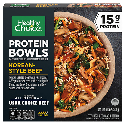 Boost your day with Healthy Choice Protein Bowls Korean-Style Beef. Each Healthy Choice frozen entree is a delicious way to get a reliable source of fiber and protein to help you power through your day. This high-protein frozen meal features seasoned, braised, all-natural USDA choice beef¹ and mixed vegetables, including carrots, mushrooms, and bamboo shoots, served with a multigrain blend in a savory, spicy Gochujang sauce, perfect for a nourishing meal to fuel your body. A delicious way to keep you feeling satisfied, this power bowl frozen meal provides 20% of your daily protein with 15 grams per serving and 18% of your daily dietary fiber with 5 grams per serving and is perfect for a satisfying lunch or quick dinner. Simply microwave this frozen beef bowl for 4 to 5 minutes and let stand for 1 minute. Keep in the freezer until ready to enjoy. ¹No artificial ingredients. Minimally processed.