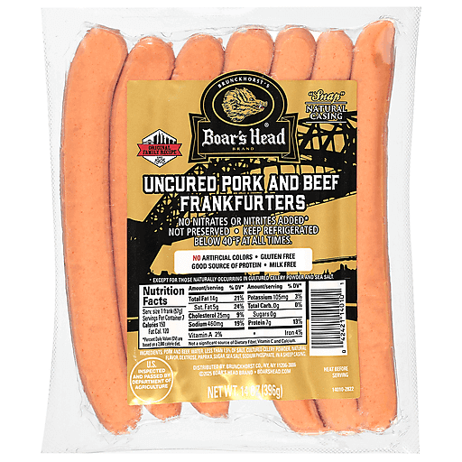 Boar's Head Uncured Pork & Beef Frankfurters 14 OzCrafted from an original family recipe, Boar's Head® Uncured Pork & Beef Frankfurters are made with high quality, hand-packed cuts of beef & pork for a unique flavor and superior bite.