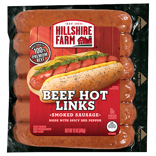 Enjoy flavorful, quality sausage with Hillshire Farm Beef Hot Links Smoked Sausage with Spicy Red Pepper. Fully cooked and ready to heat & eat, our Hillshire Farm Hot Links are made with 100% premium beef. Seasoned and smoked to perfection, our beef hot sausage links with spicy pepper come in 12-ounce packs with 6 servings each. Made with spicy red pepper to bring on the heat, our Hillshire Farm hot beef links are easy to make on a grill, stove top, or microwave for a weeknight dish everyone can enjoy at family dinner. With 8g of protein per serving, our hot smoked beef sausage links are perfect for your next backyard barbecue. Serve with hot peppers and melted provolone cheese on a toasted bun for a hot bite. Keep refrigerated until ready to prepare and cook thoroughly. For easy-to-make smoked sausage links, enjoy Hillshire Farm Beef Hot Links. For sure, it’s Hillshire!