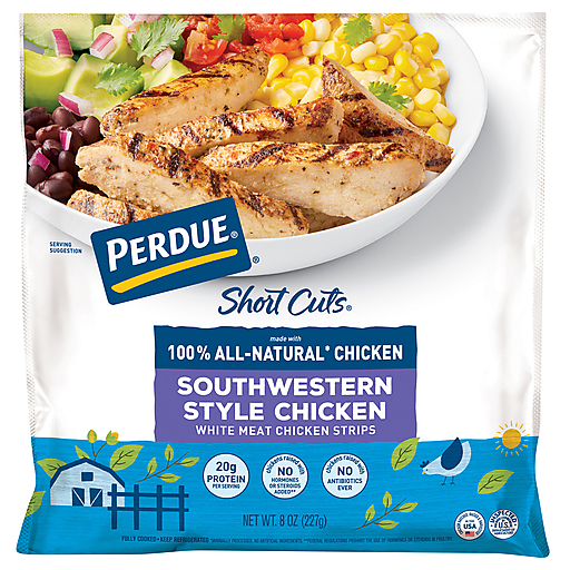 PERDUE® SHORT CUTS® Southwestern Style Chicken Strips are fully cooked chicken strips with a bold burst of flavor. Seasoned with a blend of cilantro, bell pepper, onion, and jalapeno, these chicken strips will make a delightful addition to any meal. Reinvent taco night by adding these pre-cooked chicken strips to your next fajita or quesadilla. With 20g or protein per serving, these sliced chicken strips even make an easy and tasty snack. Whether you eat them in salads, sandwiches or wraps, these protein-packed strips are ready when you are. At PERDUE®, we're hungry for better chicken and that means paying attention to all of the details, no matter how big or small. We believe our practices – like providing healthy feed and a happy environment for our chickens – lead to better-tasting chicken. And we think you’ll agree: take one bite and taste the difference that comes from our relentless pursuit of better-tasting chicken.