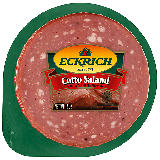 Eckrich Pre-Sliced Cotto Salami offers a delicious and convenient deli meat option that makes meal prep quick and easy. Sliced and ready to serve, the deli sliced salami is made with high quality chicken, pork and beef and is seasoned with Eckrich's signature seasonings for a rich, full flavor your whole family will enjoy. Pre-sliced for a consistent thickness, this beef cotto salami is ready to stack onto your favorite sandwich bread and pairs well with a variety of cheeses, garnishes and condiments for a wholesome lunch, dinner or snack. Enjoy this classic sliced deli salami on sandwiches, deli trays, or simply rolled up either with cheese or by itself for a nourishing, simple-to-make snack that can be enjoyed everywhere from sitting down at the lunch table to on the go. Store this salami lunch meat in the refrigerator for freshness. Craftsmanship, care and pride are guaranteed with every Eckrich product.