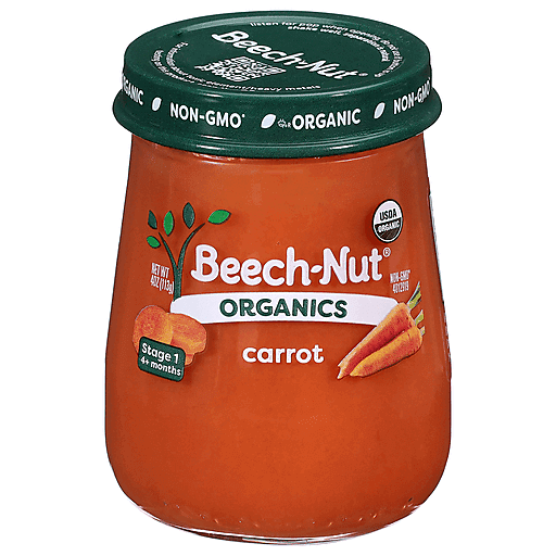 Beech-Nut Organic Baby Food is made with USDA Certified Organic and Non-GMO ingredients. Our carrot organic baby food puree has no artificial preservatives, colors or flavors and no added sweeteners--just what you'd expect for baby's first foods. Our fruits and veggies are gently cooked to preserve color, flavor, and nutrients to create a puree that's perfect for introducing solids. Free of the following allergens: dairy, gluten, peanut, soy, egg. This stage 1 baby food jar is ideal for your baby 4 months and up.