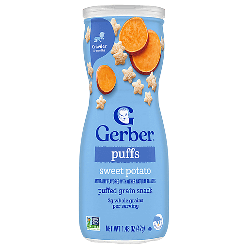 Gerber sweet potato puffs baby snacks are made with wholesome ingredients and strict quality standards just for babies. This baby finger food dissolves easily and is perfect for little hands learning to pick things up, while also encouraging self-feeding and independence. Specially crafted to delight your little one, these sweet potato puffs are a stage 3 baby food and have been designed for babies 8 months and older. Gerber understands the importance of providing nutritious food as your baby grows and develops. That’s why our dedication to quality and nutrition has been and always will be our highest priority. We're committed to being your partner in parenthood with strict quality standards, nutritious food & expert guidance. Gerber Puffs are a trusted choice for countless families.