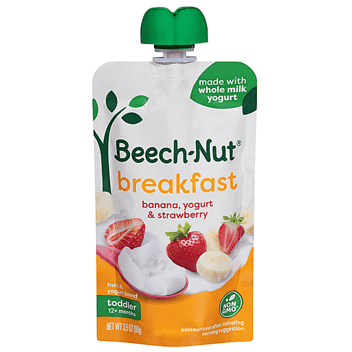 Beech-Nut Baby and Toddler Food Pouches are made with real ingredients and packed in convenient pouches for on-the-go feeding. Our delicious Breakfast blend contains banana, strawberry and whole milk yogurt for a nutritious way to start your toddler's day. Free of the following allergens: gluten, peanut, soy, egg. This Stage 4 pouch is ideal for your 12+ months old toddler.