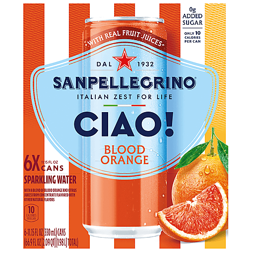 Enjoy a taste experience like no other with our Sanpellegrino CIAO! Blood Orange Flavored Sparkling Water. We've created something special – Sparkling water with real fruit juice, natural flavors, and a pinch of Sicilian salt to add refreshment to your day. With a legacy spanning over 90 years, Sanpellegrino has mastered the art of creating sparkling beverages that celebrate the Italian zest for life and timeless traditions. Experience our natural blood orange flavor with a unique blend of blood orange and citrus juices. Whether you are enjoying a moment of relaxation or entertaining guests, Sanpellegrino CIAO! blood orange adds a touch of Italian elegance to any occasion with only ten calories, 0g added sugar and a can that is recyclable and free from caffeine