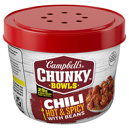 Turn up the heat on your hunger with Campbell’s® Chunky® Hot and Spicy Chili With Beans – now even spicier! This spicy hot chili is packed with kidney beans, seasoned beef and pork crumble, and red and green peppers, plus the perfect amount of spice for a bold, flavorful kick. With 25g of protein in each single-serve bowl, it’s a satisfyingly spicy chili that fuels even the heartiest of appetites. Campbell’s® Chunky® Chili is a year-round pantry staple and the MVP of game day snacks, delivering a winning combination of flavor and convenience. Enjoy a warm bowl of this microwave chili when watching the game from home, or eat it on-the-go as a convenient snack at your next tailgating event. To prepare, simply heat in the microwave for 1.5 minutes. Whether you’re a football fan or simply craving something hearty, Campbell’s® Chunky® Hot and Spicy Chili With Beans will keep you feeling full and satisfied from kickoff to the final whistle. Make every game day a winner with Campbell's Chunky®.