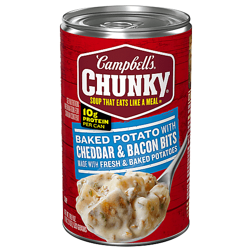 Campbell’s® Chunky® Baked Potato with Cheddar and Bacon Bits Soup isn’t just tasty—it's made to work as hard as you do. With never-ending big flavors and bold ingredients, this comfort food classic is capable of fueling even the heartiest appetite. This ready-to-eat soup is crafted with chunks of potatoes, savory bacon and cheddar cheese. Each can has 10 grams of protein*. It Fills You Up Right®. Just pop this potato soup in a microwave-safe bowl, heat and enjoy. Or, warm it over the campfire on your outdoor adventures. Whether you’re looking for quick and easy to microwave soups for home or something to take on the go, Campbell’s® has you covered. Take on the great outdoors with Campbell’s® Chunky® Baked Potato with Cheddar and Bacon Bits Soup—Soup That Eats Like a Meal®.