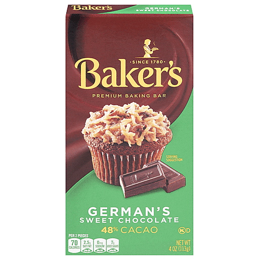 Baker's German's Sweet Chocolate Premium Baking Bar with 48% Cacao delivers quality you can trust. From America's favorite premium baking chocolate since 1780, this bar comes sweetened and ready to use in your favorite desserts. Made with a creamy blend of sugar, cocoa butter and 48% cacao, this sweet baking chocolate makes the perfect chocolate for baking with its smooth and mild flavor. Use it to whip up your favorite German chocolate cake recipe, or in your favorite rich, chocolate frosting recipe. The new scored bar snaps cleanly into 1/4 ounce pieces, so you can make small batches with the same precision as large recipes. The 4 ounce bar is wrapped allowing you to keep unused portions for your next baking session. Store it in a cool, dry spot in your pantry.