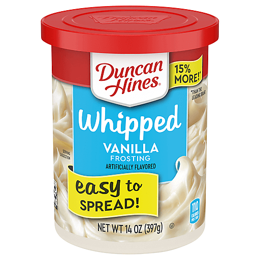 Duncan Hines Whipped Vanilla Frosting makes it easy to whip up irresistible treats. The vanilla flavor of this whipped frosting satisfies your cravings. Perfect for any occasion, this easy-to-spread frosting pairs well with chocolate or vanilla flavored desserts. Use as a chocolate cake or vanilla cake frosting, cupcake frosting or whipped topping for desserts. This can of whipped vanilla frosting is enough to generously frost two 8 or 9 inch cake layers, a 13 x 9 inch cake or up to 24 cupcakes. Keep with your cake decorating supplies to have on hand for any cookie decorating or cake decorating needs. Store the unopened can at room temperature and stir before use. Cover and refrigerate remaining frosting for up to 30 days. From whipped frosting, to single serve desserts, Duncan Hines has you covered when you're ready to bake and create. Life is as sweet as you make it!