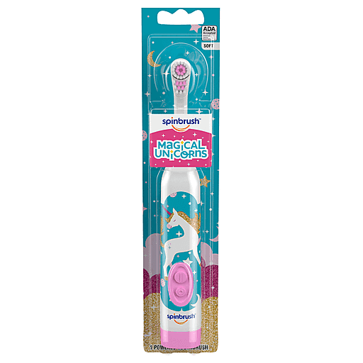 Magical unicorns and mermaids making brushing fun on the new kid’s Spinbrush! The small, soft-bristle power heads are designed to fit smaller mouths; stationary lower bristles are topped with a spinning head that oscillates to clean, even in between teeth. And the ergonomically designed toothbrush fits perfectly into little hands for a comfortable grip. Meet the new kids’ Spinbrush with faster spinning action and longer battery life! For clean and healthy teeth and gums, choose Spinbrush battery-powered toothbrushes. Comes in unicorns or mermaids, character my vary.