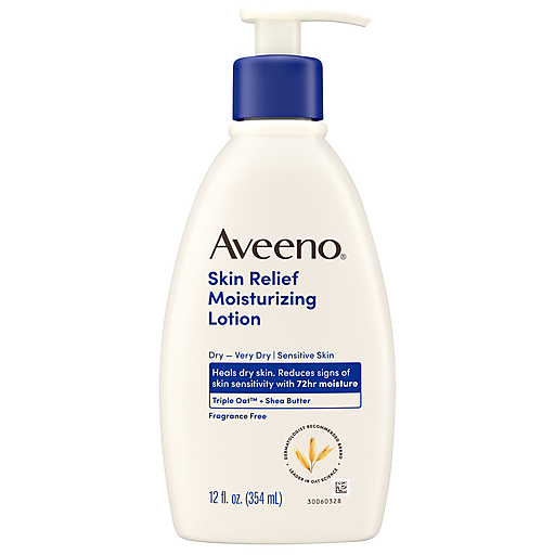 Heal dry skin with Aveeno Skin Relief Fragrance-Free Moisturizing Body Lotion. Suitable for sensitive skin, the unscented daily body lotion heals very dry skin & reduces signs of skin sensitivity** with 72-hour* moisture. The non-greasy body lotion features a soothing Triple Oat & shea butter blend which includes oat flour, oat extract & oat oil & is clinically proven to go beyond the moisture barrier to soothe dry skin from within the surface layers. Our allergy-tested lotion is non-comedogenic, so it won't clog your pores, & is suitable for sensitive skin. The gentle skin healing lotion is free of fragrances, parabens & dyes & is suitable for daily use. Experience rich, yet fast-absorbing moisture & help heal very dry skin with this non-comedogenic body moisturizer, from a dermatologist-recommended brand for over 70 years. Apply lotion as needed.