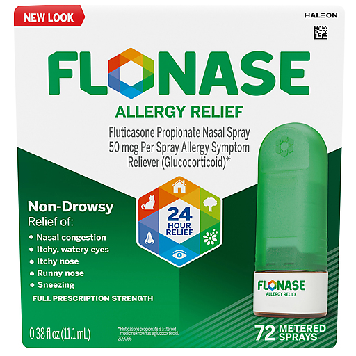 Flonase Allergy Relief Nasal Spray relieves nasal congestion, runny nose, sneezing, itchy nose, and itchy, watery eyes caused by allergens such as pollen, mold, dust, and pet dander. Its non-drowsy, 24-hour formula is perfect for combating seasonal allergies. Whether it's Spring, back-to-school, or Fall, Flonase nasal spray is your trusted solution for year-round allergy relief, recognized as the number 1 doctor recommended brand of allergy medicine (1). By blocking 6 allergic substances (2), Flonase prevents your body from overreacting to allergens. For optimal results, use daily. Simply shake gently, prime the bottle, and administer up to two sprays per nostril (for adults, children 4-11 use 1 spray per nostril per day). Safe for adults and children 4 years and older. Now available in a new recyclable paper package that's easier to open—no scissors needed!(1) Among OTC Allergy Medications based on most recent physicians' survey dated 06/02/2023(2) Flonase acts on multiple inflammatory substances (histamine, prostaglandins, cytokines, tryptases, chemokines, and leukotrienes). The exact number of mediators and precise mechanisms are unknown