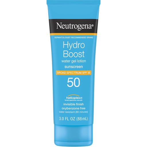Add SPF to your new skincare routine. Neutrogena Hydro Boost Water Gel Moisturizing Sunscreen Lotion with Broad Spectrum SPF 50 delivers superior broad spectrum UVA/UVB protection and hydration with a water-light, refreshing feel. This water-resistant sunscreen lotion for face & body leaves skin looking healthy and moisturized for up to eight hours without any greasy residue or white marks. The non-greasy SPF 50 sunscreen has a light, clean feel and layers invisibly under makeup. Neutrogena Hydro Boost Water Gel Lotion Sunscreen with Broad Spectrum SPF 50 is also oil-free, and non-comedogenic, which means it won't clog pores. When used as directed with other sun protection measures, the water gel sunscreen may decrease the risk of skin cancer and early aging caused by the sun. From the #1 dermatologist recommended suncare brand. New formula contains no oxybenzone and uses avobenzone for optimal protection from UVA & UVB rays.