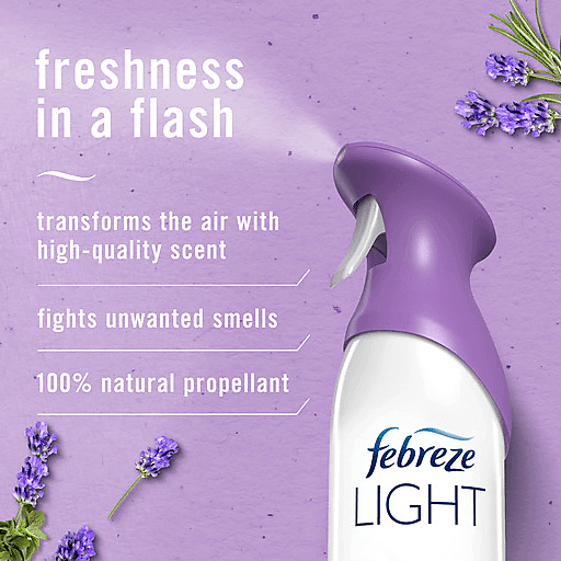 Odors. They're everywhere... lingering in the air or arising at the most awkward times. Forget masking them with some froo-froo spray; Febreze Air Effects actually fights air odors. This can of ahhh-some straight up fights stink with a neat little molecule called cyclodextrin (Bonus: It's naturally made from corn). It's a handy air freshener that's easy to use: Simply spray in a sweeping motion and fight those bad smells anywhere... the bathroom, the kitchen, that cabin you rented for the weekend, the shoe closet, your kid's room... anytime you want an instant burst of fresh. With the calming scent of Mediterranean Lavender, you can enjoy a delightful floral breeze of freshness. And because Febreze AIR uses 100% natural propellants, you can confidently freshen your home every day. Looking for even more ways to breathe happy with Febreze? Take the freshness on the road with CAR Vent Clips.