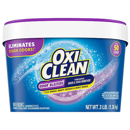 Harness the power of oxygen to remove tough stains and odors with OxiClean Odor Blasters Versatile Odor and Stain Remover Powder. This oxygen-powered, chlorine-free, color-safe laundry stain remover and odor remover helps remove stubborn smells and stains from machine-washable clothing, sheets, towels, workout clothes, shoes, team uniforms, and pet bedding, attacking tough odors like musty towels, body odor and sweat so items smell clean and refreshed. For best results, presoak items in a mixture of OxiClean powder stain cleaner and water following label directions. Then add powder per label directions to the washer, add items, and wash with detergent. Safe to use as a laundry booster in HE and standard washing machines. OxiClean Odor Blasters Versatile Odor and Stain Remover is not just for clothes. Mix with water as directed on label to eliminate odors from machine-washable fabrics and remove stains from hard surfaces in the kitchen, bathroom, and around the home. This 3 lb container is enough for big or small messes. From stain removers and laundry boosters to household cleaners and much more, OxiClean offers a product to fit your needs.