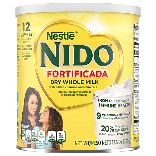 NIDO Fortificada Dry Whole Milk Powdered Drink Mix delivers 5 essential vitamins and minerals in every cup. This dry whole milk beverage for ages 4 and up contains calcium, zinc, Vitamin A, Vitamin C and iron. This dry whole milk beverage is easy to mix. Simply add 4 tbsp of Nestle NIDO Fortificada to 1 cup of warm water and mix well for a nutritious beverage the whole family can enjoy. Each 12.6 ounce canister of dry whole milk beverage contains approximately 12 servings of NIDO Whole Milk drink. Store your can of Nestle NIDO Fortificada in a cool, dry place.