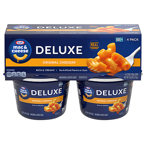 Help yourself to a cup of comfort. Kraft Deluxe Mac and Cheese Dinner Cups are easy and ready in just minutes. Kids and adults love the rich taste and creamy texture of macaroni pasta with cheesy goodness. Easy mac cups include macaroni pasta and original flavor cheese sauce mix so you have everything you need to make delicious, quick mac and cheese by just adding water. Looking for microwave meals, kids meals or instant mac and cheese? Our macaroni cups are a great choice. With no artificial flavors or dyes, our microwavable macaroni and cheese cups make a perfect snack or a classic meal side. Preparing our microwavable food is a breeze. Just combine the pasta with water up to the fill line in the cup, microwave for 3.5 minutes and stir in the cheese sauce mix. Each sleeve includes four 2.39-ounce microwavable meals. Stir up new ways to enjoy Kraft Mac n Cheese by adding protein, hot sauce, condiments, or seasonings to make it your own. A wholesome tradition, Kraft Mac & Cheese has been bringing generations together since 1937. Kraft Mac and Cheese inspires the positive power of comfort, so keep your pantry stocked with our dinner sides and enjoy cheesy goodness anytime.