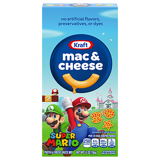 Help yourself to a bowl of comfort. Kids and adults love the classic taste of Kraft Original Mac & Cheese Macaroni and Cheese Dinner, featuring Super Mario Power-Up shapes. Our 5.5-ounce mac and cheese box includes original flavor cheese sauce mix and pasta shaped like Super Mario Power-Ups, featuring the iconic Fire Flower, Super Star and Super Mushroom, so you just need milk and margarine or butter to make tasty mac and cheese kids love. Our warm, cheesy macaroni goodness fills your belly and feeds your soul. With no artificial flavors, preservatives or dyes, Kraft Macaroni and Cheese is always a great choice for family dinners. Looking for quick meals, sides or kids meals? Simply boil 6 cups of water, stir in macaroni and cook 11-12 minutes. Drain the macaroni, do not rinse and return to the pan. Then add margarine or butter, milk and cheese sauce mix, and mix well. Stir up new ways to enjoy Kraft Mac n Cheese by adding protein or seasonings to make it your own. Try crispy bacon, shredded rotisserie chicken, steamed broccoli, hot sauce, and more! A wholesome tradition, Kraft Mac & Cheese has been bringing generations together since 1937. Kraft Mac & Cheese inspires the positive power of comfort, so keep your pantry stocked with our dinner sides and enjoy cheesy goodness anytime.
