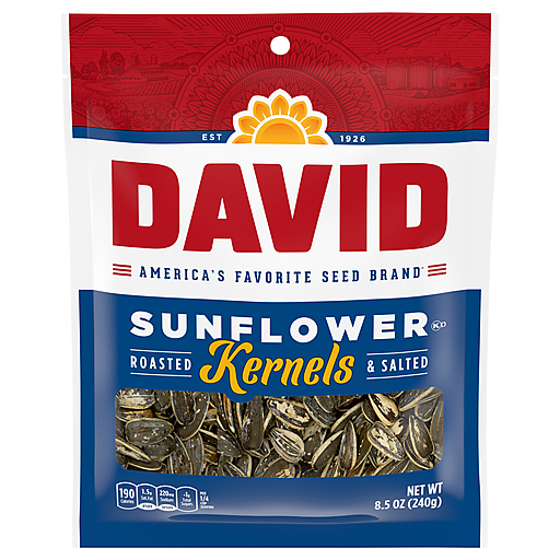Hunger won't wait for crunch time. Grab a bag of DAVID Original Sunflower Kernels to tide you over through the home stretch. Snack on these satisfyingly-crunchy and salty sunflower kernels whenever hunger strikes a. Each 8.5 oz Pack contains 8 servings, with 190 calories, 5 grams of protein, and 2 grams of fiber, as well as 10% of your daily allowance of Vitamin E, 20% of phosphorus, and 20% of magnesium per serving. Since 1926, DAVID Seeds provides a quality difference that you can taste with select top-quality seeds and kernels, roasted and seasoned to perfection. This Pack contains one 8.5 oz bag of DAVID Original Sunflower Kernels, great for snacking.
