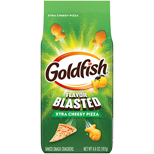 Add pizza to the snack list with Goldfish® Flavor Blasted® Xtra Cheesy Pizza Crackers! These little crackers pack a big punch with their bold, cheesy pizza flavor that's delightfully munchable. The crispy texture of these snack crackers adds a satisfying crunch to every bite. Baked with real cheese and colors sourced from plants, these Goldfish® crackers deliver an Xtra deliciously cheesy experience that will make the whole family smile. This 6.6-ounce bag of Goldfish® Flavor Blasted® Xtra Cheesy Pizza Crackers has plenty to go around and is perfect for sharing during snack time or taking along on a picnic.