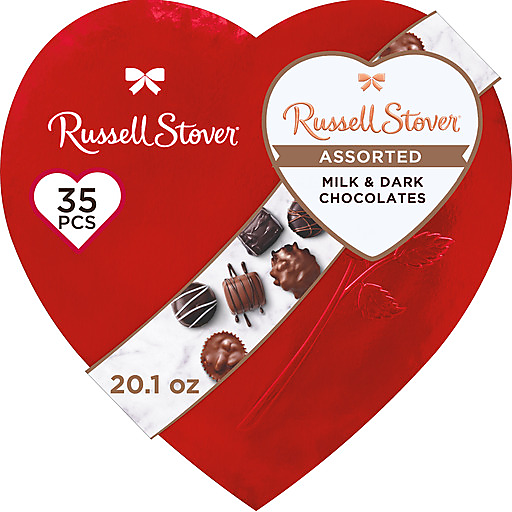 Celebrate Love with the Iconic RUSSELL STOVER Red Foil Heart Chocolate Box! RUSSELL STOVER Valentine's Day Red Foil Heart Assorted Milk Chocolate & Dark Chocolate Gift Box, 20.1 oz., is the perfect way to express your love this Valentine's Day! This 35 piece collection of 12 delicious favorites includes: Milk Chocolate Caramel, Dark Chocolate Caramel, Milk Chocolate Peanut Cluster, Milk Chocolate Truffle, Dark Chocolate Truffle, Dark Chocolate Nut Caramel, Milk Chocolate Pecan Delight, Milk Chocolate Toffee, Dark Chocolate Vanilla Crème, Dark Chocolate Almond Cluster, Milk Chocolate Chocolate Butter Cream, Milk Chocolate Cashew Cluster, Milk Chocolate Strawberry Crème, and Dark Chocolate Raspberry Crème. Share the love with RUSSELL STOVER - an American-made classic since 1923. Made from our hearts with tradition and passion, we are proud to be part of your sweet traditions and everyday indulgences.