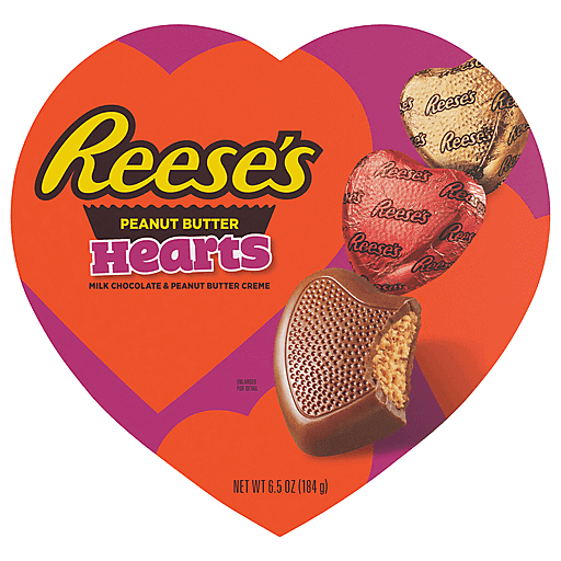 Make Valentine's Day gift-giving even more exciting with a REESE'S chocolate and peanut butter creme hearts candy gift box. This candy gift box is best paired with a card and flowers to sweeten up any Valentine's Day celebration. Who wouldn't want to celebrate the holiday with scrumptious REESE'S hearts filled with peanut butter creme covered in chocolate candy? Give this festive gift box to your family members, friends and colleagues to fill their day with a fun peanut butter creme treat. Don't forget to keep one for yourself, too! Hand out REESE'S chocolate and peanut butter creme hearts during family movie nights, as an after-dinner dessert or as you enjoy an evening of baking festivities with your loved ones. Add REESE'S heart-shaped treats to your favorite recipes to make delicious holiday peanut butter creme desserts. Stuff a REESE'S chocolate peanut butter creme heart candy inside your favorite cookie dough, place a few on top of a yummy chocolate cake or add some to your ice cream sundae toppings bar. REESE'S hearts candies are a decadent bite of peanut butter creme surrounded by smooth chocolate candy. A classic treat you just can't beat, Valentine's Day wouldn't be the same without them!