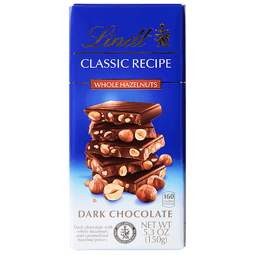 Indulge in smooth dark chocolate with whole hazelnuts and caramelized hazelnut pieces with Lindt CLASSIC RECIPE Whole Hazelnut Dark Chocolate Bar. Expertly crafted with premium dark chocolate and decadent hazelnuts, this dark chocolate candy bar delivers a rich, delicious flavor. Enjoy this indulgent treat after dinner or as a midday pick-me-up. Made with the finest ingredients, this bar also makes a delicious gift for any chocolate lover. Each bar is portioned into perfect bite-sized pieces, making it easy to share or enjoy a few pieces anywhere. Lindt chocolate embodies the passion and expert craftsmanship of the Lindt Master Chocolatiers for a distinctly smooth melting chocolate experience in every bite.