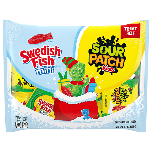 Spread a little mischievous and nostalgic holiday cheer with SOUR PATCH KIDS and SWEDISH FISH Mini Holiday Candy Variety Pack. Each candy bag is filled with 22 individually wrapped, treat-size snack packs of SWEDISH FISH and SOUR PATCH KIDS soft candy in classic shapes and fruit flavors. This fun and fruity candy mix variety pack offers a SOUR THEN SWEET treat in playful kid shapes and a signature red candy fish shape. These individual bags of candy make great stocking stuffers and movie snacks for sharing with friends and family while watching your favorite holiday movies. Perfectly sized for tossing in backpacks, lunchboxes, and Christmas candy bags, or for including with holiday gifts, these festive variety packs of gummy snacks also are wonderful classroom party favors and holiday game prizes. This bagged candy mix of chewy candy favorites in shareable snack packs is perfect for all the sweet moments of the season.