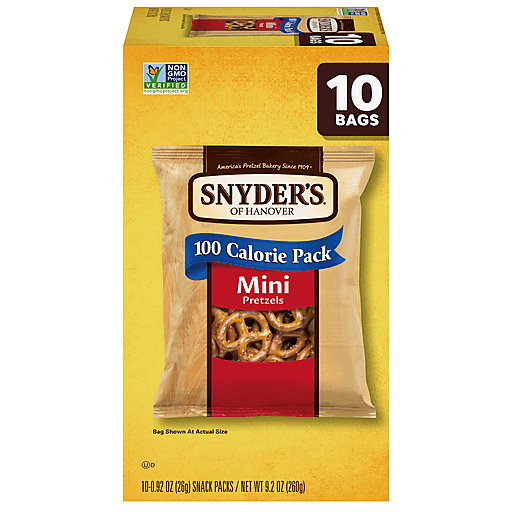 100 Calorie Mini Pretzels from Snyder’s of Hanover are slow baked for an irresistibly crunchy, bite-size snack. They give you all the delicious taste of our traditional pretzels in 10 individual Mini Pretzel snack packs. They’re ideal for lunch, sports, on the go, or at school. Everyone can feel good about enjoying this Non-GMO Project Verified snack, which is made in a facility that doesn’t process peanuts, making them perfect for school. Snyder’s of Hanover has been America’s Pretzel Bakery since 1909 – that’s how we perfected that one-of-a-kind flavor and crunch. Snyder’s of Hanover Pretzels are created from quality ingredients, kneaded, and oven baked to seal in all the goodness. It’s no wonder our snacks have been shared across tables, between generations, from one end of the country to the other – making us America’s favorite pretzel brand. This 10-pack of 100-Calorie Snyder’s of Hanover Pretzels is ideal for stocking up your pantry and your office to feed all your crunch cravings. Start munching Snyder’s of Hanover Pretzel snacks.