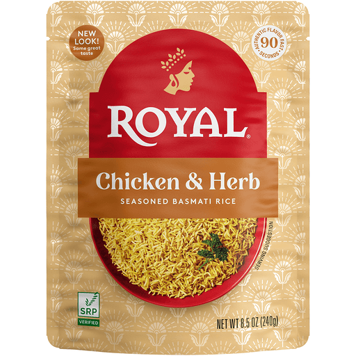 Flavored basmati rice. No artificial flavors. Per Serving: 240 calories; 0.5 g sat fat (3% DV); 490 mg sodium (21% DV); 1 g total sugars. Gluten free. Vegetarian. Non-GMO. Made with Non-GMO ingredients. A tradition of excellence. No preservatives. 90 sec cook time. Royal Chicken & Herb Flavored Basmati Rice starts with 100% authentic basmati rice grown and harvested by farmers at the foothills of the Himalayas. This delicious and aromatic long-grain rice is combined with a special blend of herbs and spices reminiscent of mom's home cooking to create a rice dish sure to become a new family favorite. We encourage you to create new culinary traditions or revisit old ones by joining your family's favorite recipes with authentic Royal rice. www.authenticroyal.com. Facebook. Instagram. Pinterest. (at)AuthenticRoyalFoods. Share your traditions with us today. (hashtag)Rtraditions. BPA free. Non-toxic plastic. No phthalates. No bisphenol-A. Basmati rice proudly grown in India.