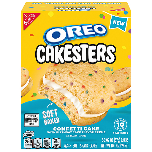 OREO Cakesters Confetti Cake Soft Snack Cakes are a delicious, colorful, soft-baked twist on the OREO Sandwich Cookie taste. These OREO snack cakes sandwich birthday cake flavored-creme filling between two soft yellow confetti cakes, making them tasty, sweet snacks for all ages. Each snack pack includes two OREO Cakesters Soft Snack Cakes, wonderful for packing into adult lunches and serving as birthday treats, office snacks, or after-school snacks for kids and adults. In individually wrapped packs that are great for grabbing on the way out the door, these snack cakes are delicious on the go snacks or travel snacks. These convenient snacks make a great addition to your grab-and-go snack treats. OREO Cakesters — the delicious twist on America’s Favorite OREO sandwich cookie taste!