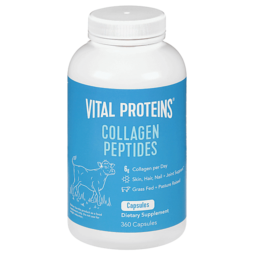 Dietary Supplement. 6 g collagen peptides. Paleo friendly. Dairy free. Gluten free. Typical Amino Acid Profile. Amount per serving. Alanine 241 mg; Arginine 250 mg; Aspartic Acid 197 mg; Glutamic Acid 369 mg; Glycine 613 mg; Histidine (Essential Amino Acids) 24 mg; Hydroxylysine 36 mg; Hydroxyproline 339 mg; Isoleucine (Essential Amino Acids) 45 mg; Leucine (Essential Amino Acids) 86 mg; Lysine (Essential Amino Acids) 102 mg; Methionine (Essential Amino Acids) 17 mg; Phenylalanine (Essential Amino Acids) 62 mg; Proline 343 mg; Serine 102 mg; Threonine (Essential Amino Acids) 57 mg; Tryptophan 0 mg; Tyrosine 15 mg; Valine (Essential Amino Acids) 72 mg. Contains 8 of 9 essential amino acids. Skin, hair, nail + joint support. Grass fed + pasture raised. Look & feel your best. Our Collagen Peptides is made from just one simple ingredient, easily boosting your collagen intake to help you look and feel your best wherever you go. Take them when you want, where you want, with no blending or mixing required. 1 simple ingredient. Youthful appearance. Skin hydration. Skin elasticity. Healthy joints & bones. Convenient capsule. Hair & nail support. Made with vital protein proprietary bovine hide collagen peptides. Whole 30 approved. vitalproteins.com. (hashtag)Stayvital. BPA free. (These statements have not been evaluated by the Food and Drug Administration. This product is not intended to diagnose, treat, cure or prevent any disease.)